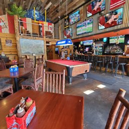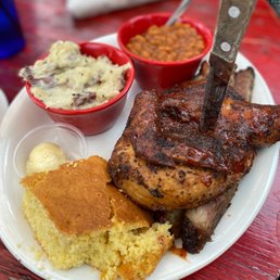The food looked good but it was anything but good. The service was great, all the people were really nice and all. The food was just terrible, we won't ever go back. We are a family of and we ordered a number of things off the menu. We got BBQ baby back ribs which we thought would be the best item on the menu but it wasn't, It seemed like it was just cooked enough not to be raw and it turned out to be a real challenge to chew the meat off the bone. We Also ordered a half BBQ chicken which was so awful dry every bite I took and had to drink to wash it down. The pulled pork sandwich was the last adult entree we ordered and it was flavorless. For sides we got fries, BBQ beans, coleslaw, and Mac and cheese ($ upcharge for the Mac). All these sides we ended up not fully eating, we all took a little taste and decided against eating them. The beans were cold and seemed to be not cooked enough, the fries were mushy, the Mac was cold and the cheese on it was hardening up. The entrees came with cornbread which was ok, the kids didn't like it because there was jalapenos in it and some Cajun spices. The coleslaw was just ok, very plain. Their BBQ sauce bottle they have at the table has a bit of a kick to it so the kids didn't like it. We got one kids entree which was a grilled cheese, it came out a little on the burnt side but that is how our daughter likes it and she enjoyed her grilled cheese. It was a struggle to eat about half the food mainly because we were starving, and the other reason was we were spending quite a bit and didn't want it to go to waste. Our total bill came out to $.The place seems to be busy but I have a feeling it's because of the "Bar" and not the food.Parking: Very tight one way parking lot which makes parking a full size truck difficult.
